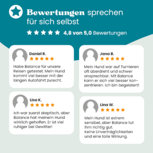 Ich war zuerst skeptisch, aber Balance hat meinem Hund wirklich geholfen. Er ist viel ruhiger bei Gewitter!