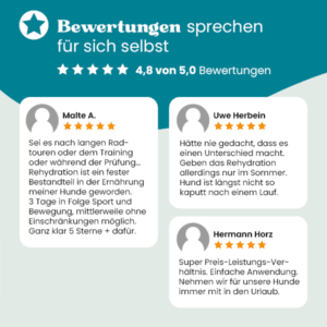 Unser Lieblingsprodukt ist „Rehydration“. Mein Hund Ace verträgt es super und ist nach einem anstrengenden Agility-Training wieder schneller fit. Klare Kaufempfehlung!